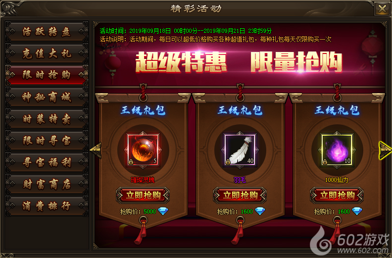 活动内容:活动期间,每日可以超低价格购买各种超值礼包,每个礼包每天限购一次。