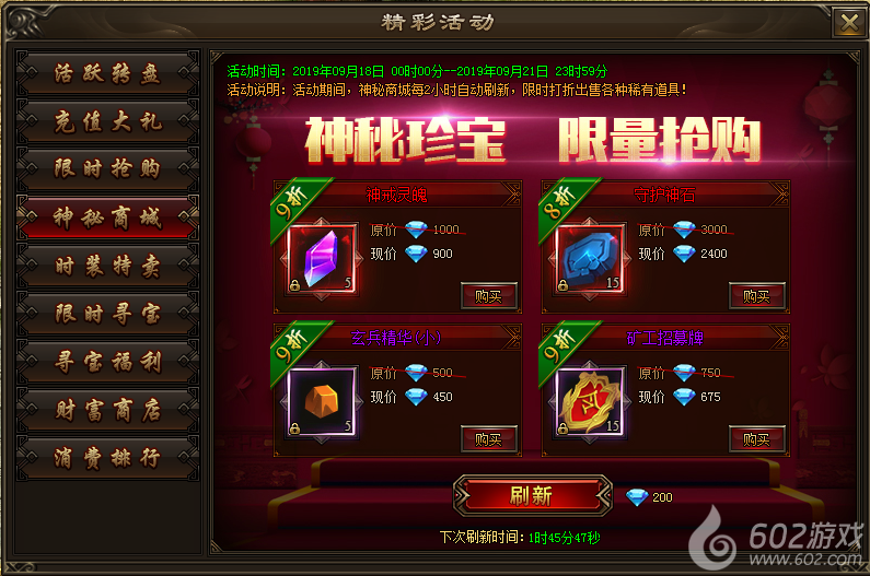 活动内容:活动期间,神秘商城每2小时自动刷新,限时打折出售各种稀有道具!