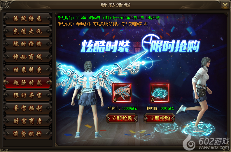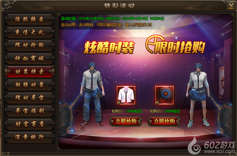 活动内容:活动期间,可购买酷炫时装,每人仅可购买1次。