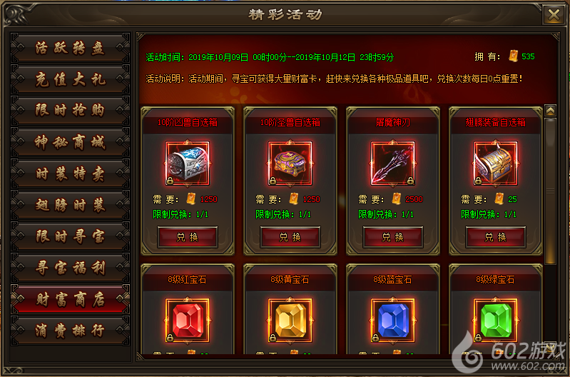 活动内容:活动期间,寻宝可获得大量财富卡,使用财富卡可在财富商城兑换海量极品道具。
