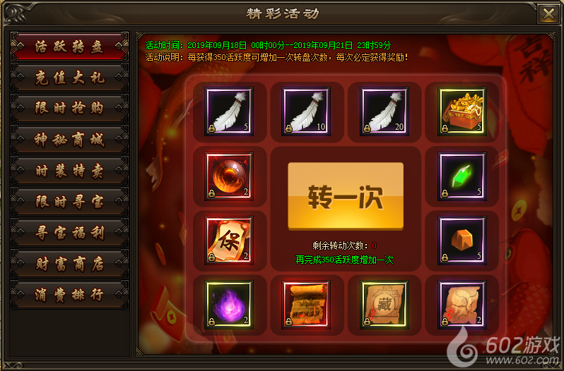 活动内容:活动期间,每获得350活跃度可增加一次转盘次数,每次必定获得奖励。