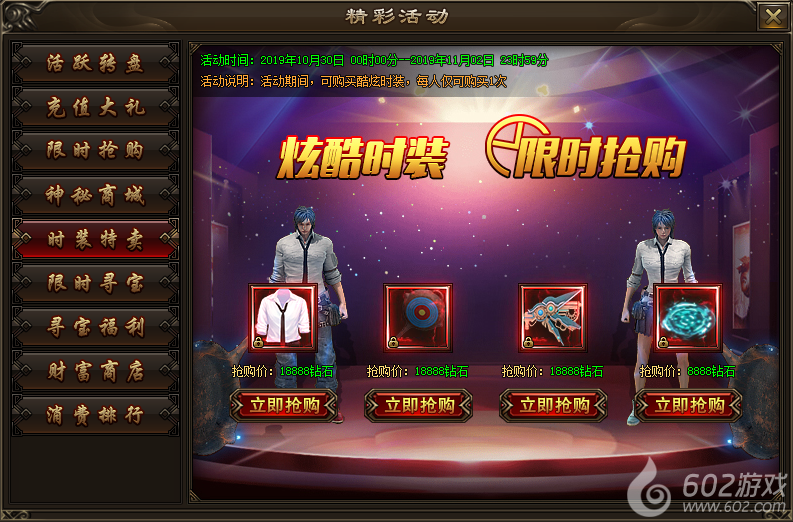 活动内容:活动期间,可购买酷炫时装,每人仅可购买1次。