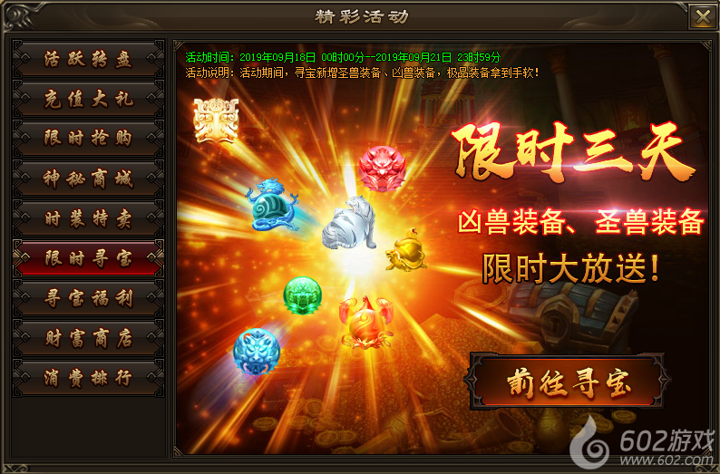 活动内容:活动期间,寻宝新增圣兽装备、凶兽装备,极品装备拿到手软!