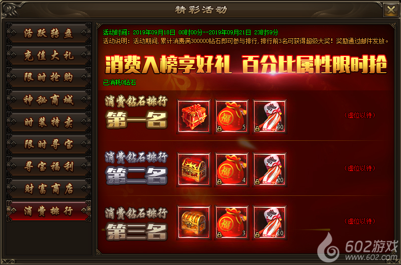 活动内容:活动期间,累计消费满300000钻石即可参与排行,排行前3名可获得超级大奖。奖励将在活动结束后通过邮件发放。