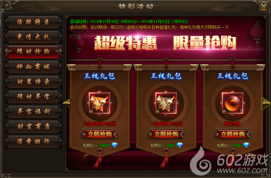 活动内容:活动期间,每日可以超低价格购买各种超值礼包,每个礼包每天限购一次。