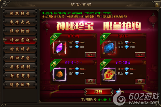 活动内容:活动期间,神秘商城每2小时自动刷新,限时打折出售各种稀有道具!