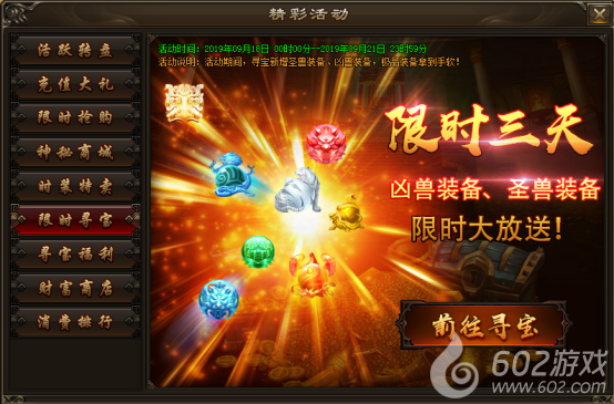 活动内容:活动期间,寻宝新增圣兽装备、凶兽装备,极品装备拿到手软!