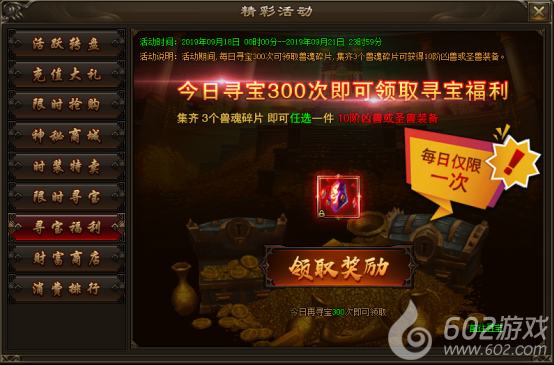 活动内容:活动期间,每日寻宝300次可领取兽魂碎片,3个兽魂碎片可合成兽魂自选袋,可任选一件10阶凶兽或圣兽装备,每日仅限领取1次兽魂碎片。