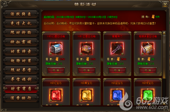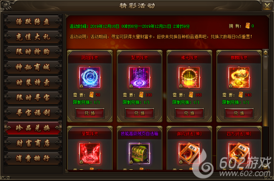 活动说明:活动期间将限时开放珍品兑换,可以使用财富卡兑换阵法道具,[神]技能书。