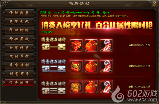 活动内容:活动期间,最低累计消费满100000钻石即可参与排行,排行前3名可获得超级大奖。奖励将在活动结束后通过邮件发放。