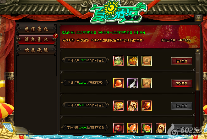 活动内容:活动期间,累计消费钻石数量达标即可领取豪华奖励。