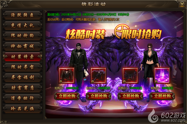 活动内容:活动期间,可购买酷炫时装,每人仅可购买1次。