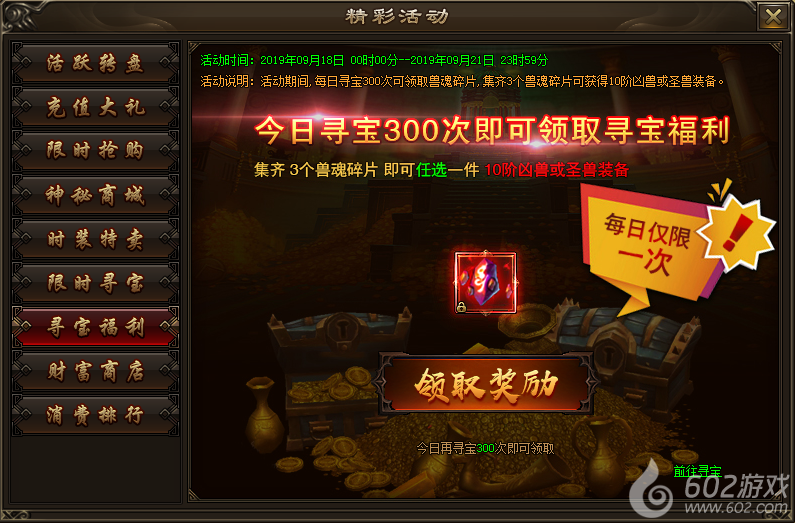 活动内容:活动期间,每日寻宝300次可领取兽魂碎片,3个兽魂碎片可合成兽魂自选袋,可任选一件10阶凶兽或圣兽装备,每日仅限领取1次兽魂碎片。