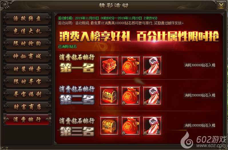 活动内容:活动期间,最低累计消费满100000钻石即可参与排行,排行前3名可获得超级大奖。奖励将在活动结束后通过邮件发放。