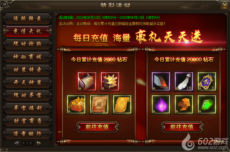 活动内容:活动期间,每日充值20元和200元即可获得超值奖励。