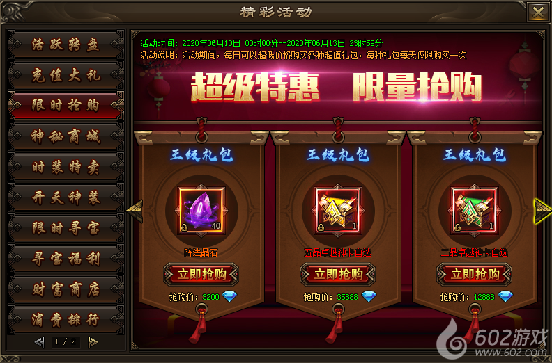 活动内容:活动期间,每日可以超低价格购买各种超值礼包,每个礼包每天限购一次。