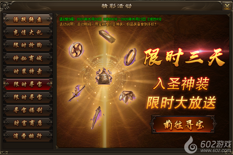 活动内容:活动期间,寻宝可获得大量财富卡,使用财富卡可在财富商城兑换海量极品道具。