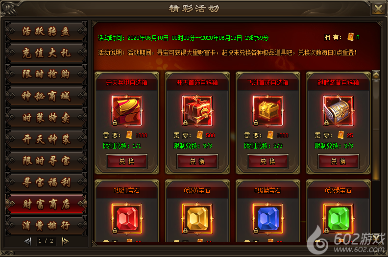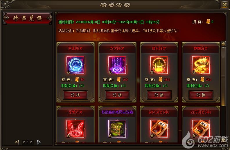 活动内容:活动期间,限时开放财富卡兑换法阵道具,[神]技能书等大量珍品!