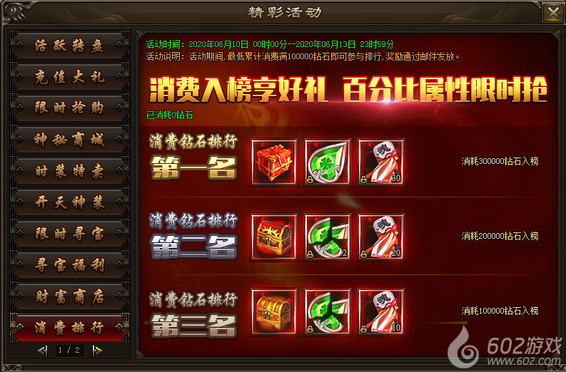 活动内容:活动期间,最低累计消费满100000钻石即可参与排行,排行前3名可获得超级大奖。奖励将在活动结束后通过邮件发放。